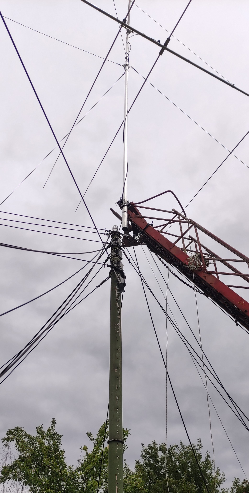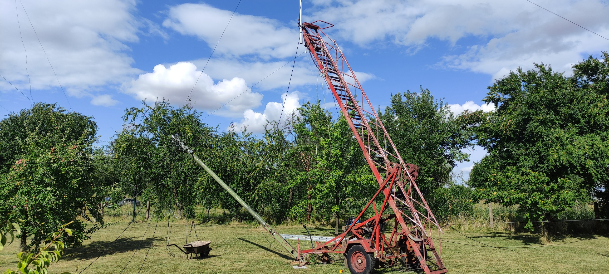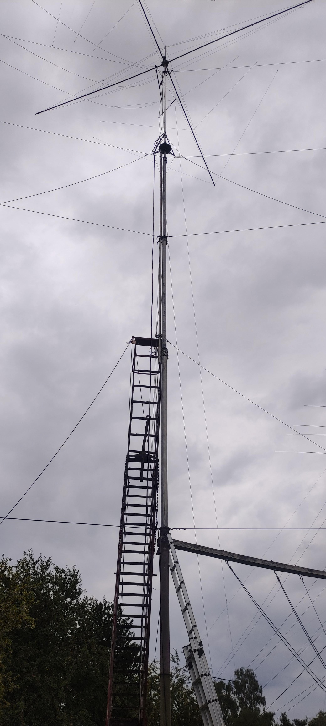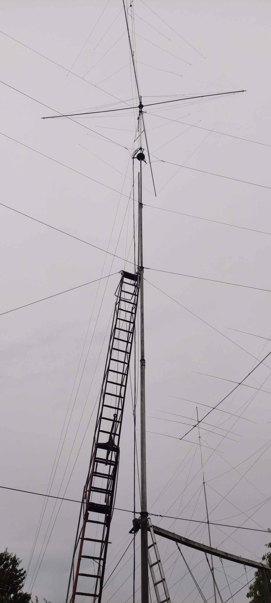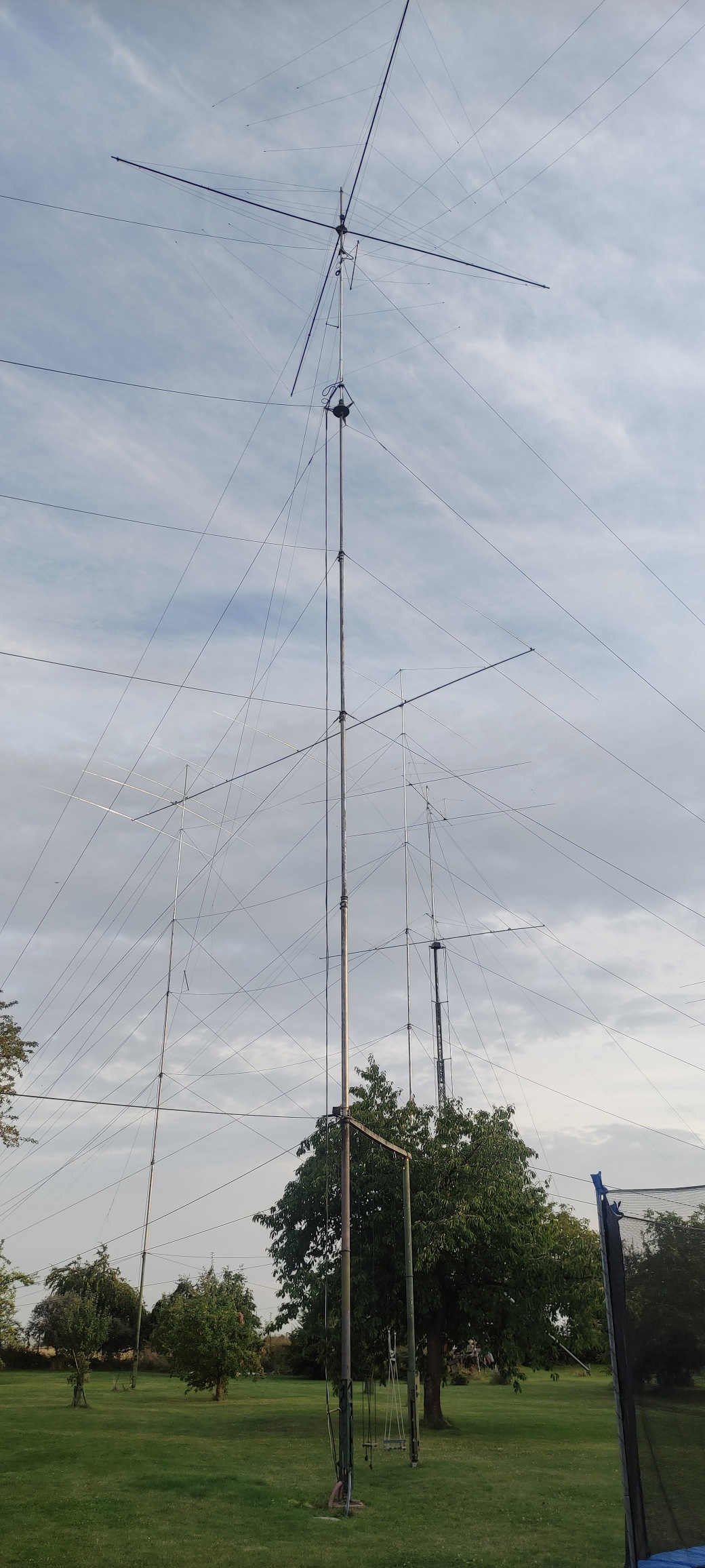 19TA mast extended by 6 m. SpiderBeam at a height of 25 m, just below it the apex of the inv. V for 80 m CW, 80 m SSB, and 160 m.